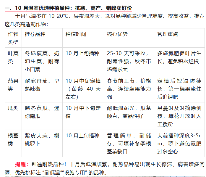十月是温室大棚 “承上启下” 的关键期:既要抢种秋冬茬作物,为冬春上市打基础,又要做好温室设施维护,应对即将到来的低温天气。今天就从 “种什么”“怎么管”,给种植户朋友们一份实用指南!