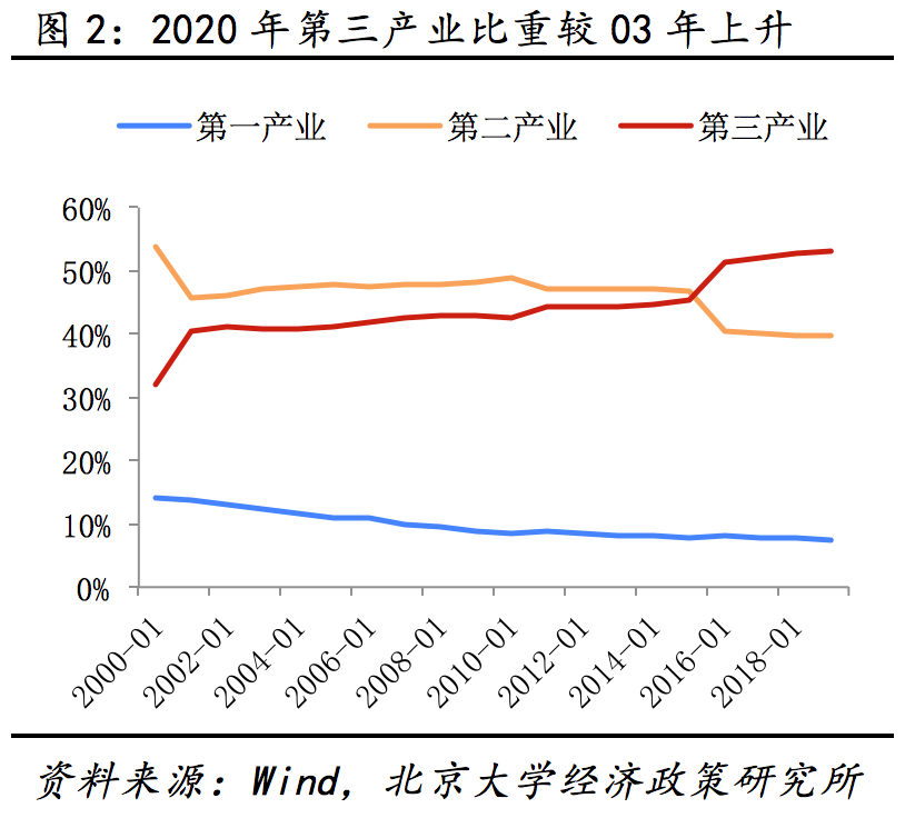 二、第三产业占比更高疫情冲击加大。近年来随着经济结构转型,第三产业占我国GDP的比重不断上升,2003年第三产业比重仅为40%,2020年已上升至53%。疫情对第三产业的拖累或对经济带来更大冲击。