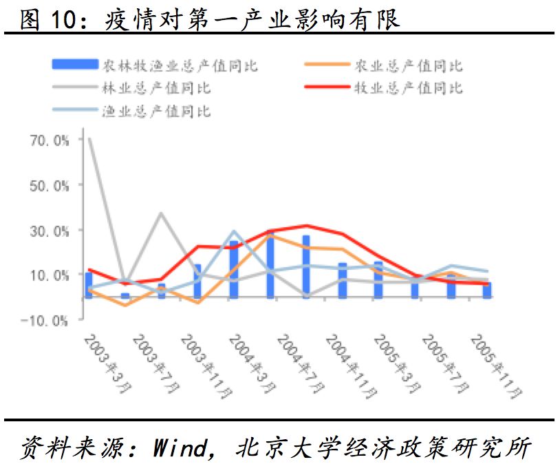 第一产业家禽水产养殖等行业或受影响,但整体冲击较为有限。部分地区由于农业生产资料运输受阻,出现蔬菜、畜禽养殖所需饲料进出困难,种畜禽无法调运,只好宰杀掩埋,损失较大。但随着农业部等要求严格执行“绿色通道”制度,运输障碍有望较快扫清。疫情对林、牧业影响较小,非典时期林、牧业2003年二季度同比虽有所下滑但仍能保持正增长,且下半年林业、牧业产能修复较快,全年同比分别为20%和12.8%。总体而言,农、林、牧、渔的修复能力很强,疫情很难对其造成长期影响。近年来,第一产业对GDP的贡献率不断下降,2019年第一产业贡献率为3.8%,可见农林牧渔对经济整体的影响程度有限。我们认为第一产业一季度GDP增速或放缓0.1个百分点,影响GDP0.07个百分点。