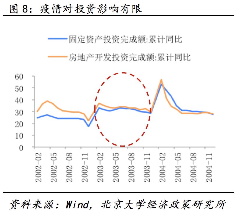 房地产投资或将继续发挥稳定器的作用。回顾03年“非典”,房地产开发投资整体较为平稳,国房景气指数虽有所下滑但仍保持在105偏高水平线以上。分类来看,住宅投资情况较为稳定,同比未见下滑,而办公楼、商业营业用房投资完成额在3、4月有一定波动,待疫情稳定后同比回升至正常水平。土地购置方面,3月同比下滑39.8个百分点至38.8%,后于4月继续下滑至28.8%,5月同比回升至56.7%。可见疫情对供给侧有一定负面影响,但房地产开发投资等方面韧性较强,疫情不能对其形成长期影响。需求方面,疫情对房地产销售的影响虽大,但同样难以形成长期影响。03年4月后销售额、销售面积同比大幅下降,为全年低点,5月疫情过后便回升至正常水平。