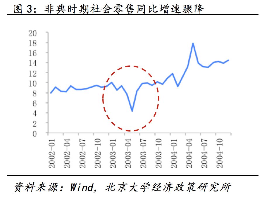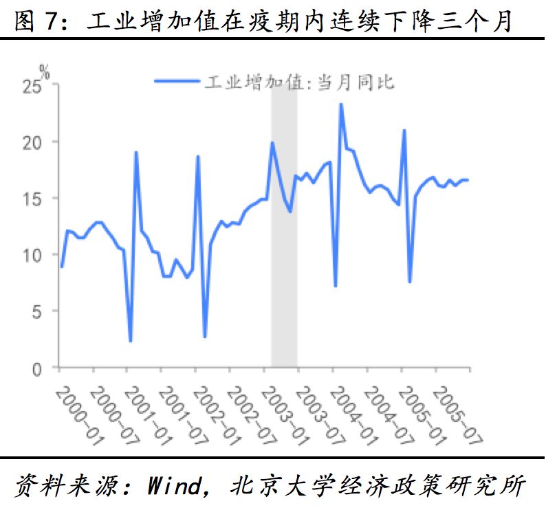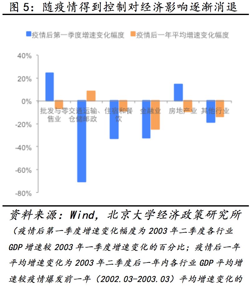 2003年非典短期内主要冲击消费与第三产业。03年4月之后政府在教育、旅游、交通运输等领域出台了必要防疫措施,疫情对经济的影响于二季度彻底显现,第一、第二和第三产业较上一季度分别下降1.1%、1.9%和1.8%,二季度GDP下降2%至9.1%。由于第三产业多数行业具有出行与聚众属性,受疫情冲击最重,第二产业次之,第一产业受影响较轻。第三产业中,受出行管制影响,交通运输、住宿餐饮行业受冲击较为明显,但其反弹速度较快,增速拐点领先其他行业约一个季度。批发与零售行业增速在疫情爆发初期有所上升,或与居民在疫情爆发前期囤积防疫用品、日用品与食品有关,但随后消费透支效应显现,增速开始滑落。相比之下疫情对金融业与房地产业的冲击相对滞后且持续时间较长。