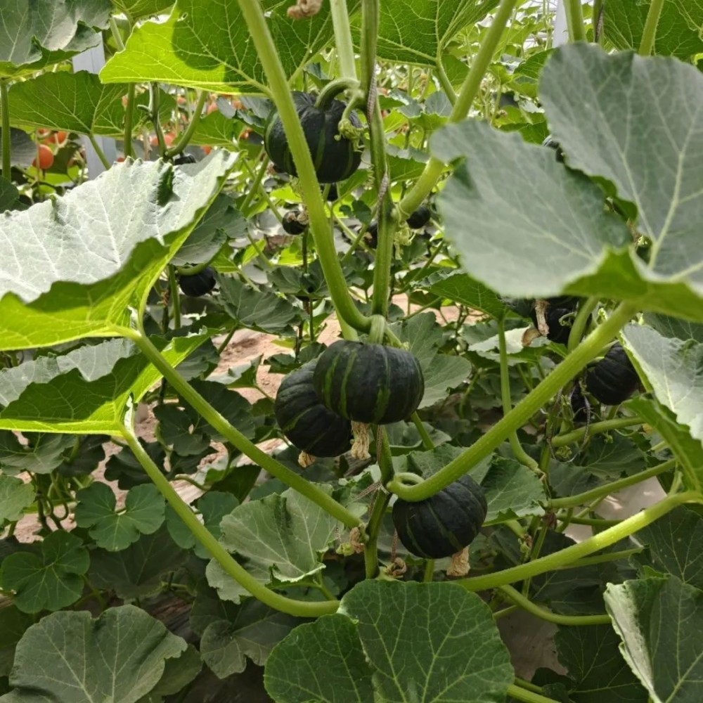 只见各类瓜果蔬菜长势喜人,翠绿的藤蔓上,橙色的金丝南瓜、黄澄澄的甜瓜缀满枝头,鲜嫩的叶菜在柔光中舒展,颗颗饱满的果实仿佛在诉说着丰收的喜悦。